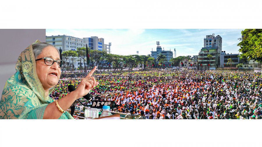 বুধবার (২০ ডিসেম্বর) বিকাল ৪টা ২০ মিনিটে সিলেট জেলা ও মহানগর আওয়ামী লীগ আয়োজিত আলিয়া মাদ্রাসা মাঠে নির্বাচনি জনসভায় প্রধান অতিথির বক্তব্যে প্রধানমন্ত্রী এসব কথা বলেন। এর আগে বেলা ৩টা ১০ মিনিটে সভামঞ্চে পৌঁছেন তিনি।
