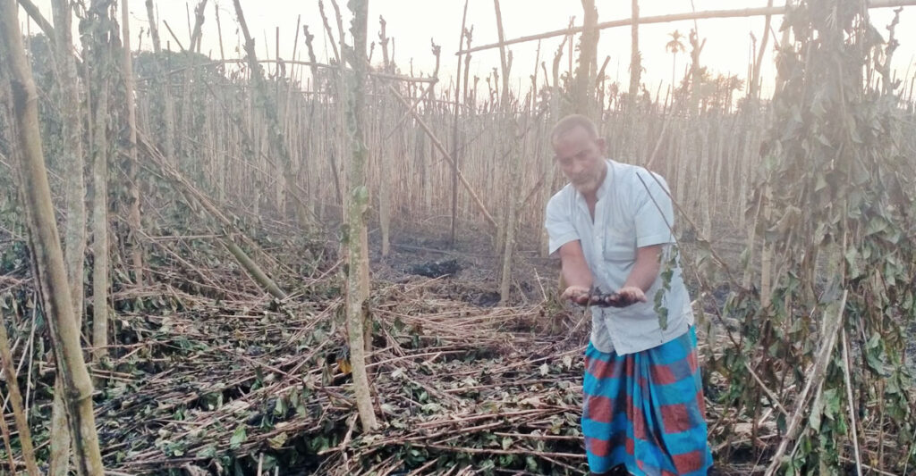 ফারুক হোসেন নামে ক্ষতিগ্রস্ত অপর এক কৃষক জানান, তারও দুই বিঘা পানের বরজ পুড়ে গেছে। এতে তার ১০ থেকে ১২ লাখ টাকার ক্ষতি হয়েছে। এই আগুনে সবমিলিয়ে কৃষকদের প্রায় আড়াই কোটি টাকা ক্ষতি হয়েছে বলে তিনি দাবি করেন।