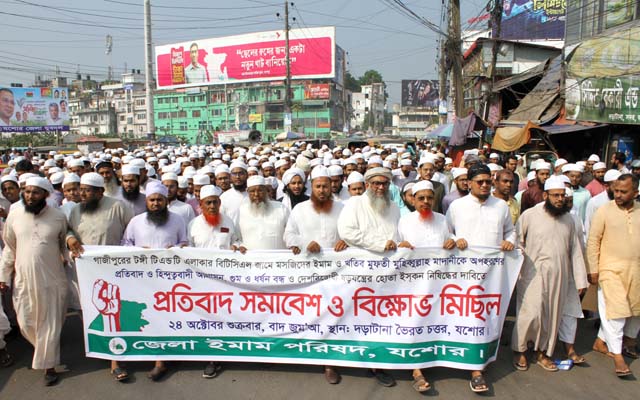 শুক্রবার বাদ জুমআ জেলা ইমাম পরিষদ যশোরের উদ্যোগে দড়াটানা ভৈরব চত্বরে মসজিদের ইমাম ও খতীবকে অপহরণের প্রতিবাদ, হিন্দুত্ববাদী আগ্রাসন বন্ধ এবং ইসকন নিষিদ্ধের দাবিতে বিক্ষোভ সমাবেশ ও মিছিল অনুষ্ঠিত হয়। বক্তারা ইসকন নিষিদ্ধ ঘোষণা, টঙ্গীতে ইমাম গুমের ঘটনায় দায়ীদের গ্রেপ্তার, গাজীপুর ধর্ষণ মামলার দ্রুত বিচার এবং রাষ্ট্রীয় নীরবতার নিন্দা জানান।