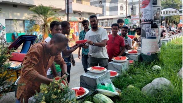 প্রচণ্ড গরমে শ্রমজীবী মানুষের জন্য এ আয়োজন এনে দেয় একটুখানি প্রশান্তি ও আনন্দ। প্লেটে করে সাজানো তরমুজ খেতে আসা মানুষদের খোসা ফেলতে রাখা হয় পলিথিন ব্যাগ, যাতে পরিবেশ পরিষ্কার থাকে।