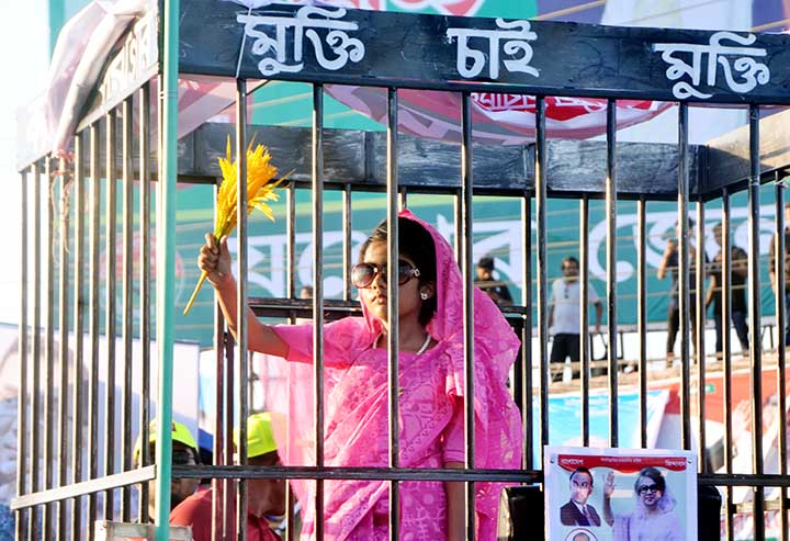 যশোর মুড়লী মোড়ে সমাবেশ শুরুর পর উপস্থিত নেতা-কর্মীদের নজর কাড়ে খালেদা জিয়ার প্রতীকী কারাগার। এর ভেতর থেকে একটি শিশু খালেদা জিয়া সেজে সবাইকে হাত নেড়ে শুভেচ্ছা জানাচ্ছিল। বিএনপির রোডমার্চের বহরে ‘কারাবন্দি খালেদা জিয়া’ সেজে সবার নজর কাড়ে হুমায়ারা জান্নাত প্রার্থনা নামে ৬ বছর বয়সী এক মেয়ে। হুমায়ারা জান্নাত প্রার্থনা ঝিনাইদহ জেলার কালীগঞ্জ উপজেলা বিএনপির যুগ্ম আহ্বায়ক হামিদুর রহমান হামিদের কন্যা। বেগম খালেদা জিয়া স্ব-শরীরে না থাকলেও প্রতীকিভাবেই তাকে উপস্থিত রাখা হয়। সেজে আসা খালেদা জিয়াকে একনজর দেখতে হুমড়ি খেয়ে পড়ে কর্মসূচিতে অংশ নেওয়া নেতাকর্মীরা। একটি প্রিক্যাপের উপরে প্রতীকী কারাগারের বাইরে নেতা-কর্মীরা খালেদা জিয়ার মুক্তির দাবিতে স্লোগান দিচ্ছিলেন। এসময় উৎসুক নেতাকর্মীরাও তার সঙ্গে সেলফি ও ছবি তুলতে দেখা যায়। পাশাপাশি মুক্তি মুক্তি চাই, খালেদা জিয়ার মুক্তি চাই গানও বাজতে শোনা যায়। প্রিক্যাপের উপরে থাকা ঝিনাইদহের কালীগঞ্জ উপজেলা বিএনপির যুগ্ম আহ্বায়ক হামিদুল ইসলাম বলেছেন, তিনি তার মেয়েকে খালেদা জিয়ার সাজে সাজিয়ে প্রতীকী কারাগারে আবদ্ধ করে সমাবেশস্থলে আসেন। মঞ্চের চারপাশে ঘোরে এই শিশু। এ সময় নেতা-কর্মীরা তাকে শুভেচ্ছা জানায়। দেখা যায়, বহরের একটি পিকআপ ভ্যানে ভ্রাম্যমাণ কারাগারে বন্দি অবস্থায় রাখা হয়েছে প্রতীকি খালেদা জিয়াকে। সেই কারাগারে বসেই হাত তুলে নেতাকর্মীদের উৎসাহ দিচ্ছেন।