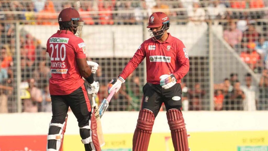 রান তাড়ায় অবশ্য শুরুটা ভালো ছিল না বরিশালের। দলীয় ১০ রানের মাথায় উদ্বোধনী জুটি ভাঙে তাদের। এনামুল হকের বলে অঙ্কনের হাতে ক্যাচ দিয়ে বিদায় নেন পাকিস্তানি ওপেনার আহমেদ শেহজাদ। ৭ বলে ১ রান করেছেন তিনি। এরপর তামিম ইকবাল ও কাইল মায়ার্সের ব্যাটে ঘুরে দাঁড়ায় বরিশাল। মুশফিক হাসানের দুর্দান্ত ডেলিভারিতে মায়ার্স ক্যাচ তুলে দেওয়ার আগে দ্বিতীয় উইকেট জুটি থেকে আসে ৫৭ বলে ৬৪ রান। প্যাভিলিয়নে ফেরার আগে ক্যারিবীয় এই ব্যাটার করেন ২৫ বলে ২৫ রান।