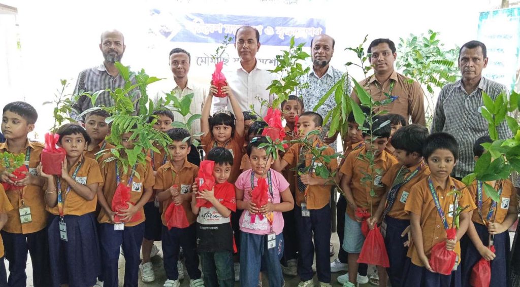 বিভিন্ন ধরণের ফল গাছের চারা পেয়ে উচ্ছ্বসিত যশোরের মৌমাছি স্কুলের শিশু শিক্ষার্থীরা। মঙ্গলবার দুপুরে প্রায় আড়াইশ’ শিশুর মাঝে এই গাছের চারা বিতরণ করা হয়।