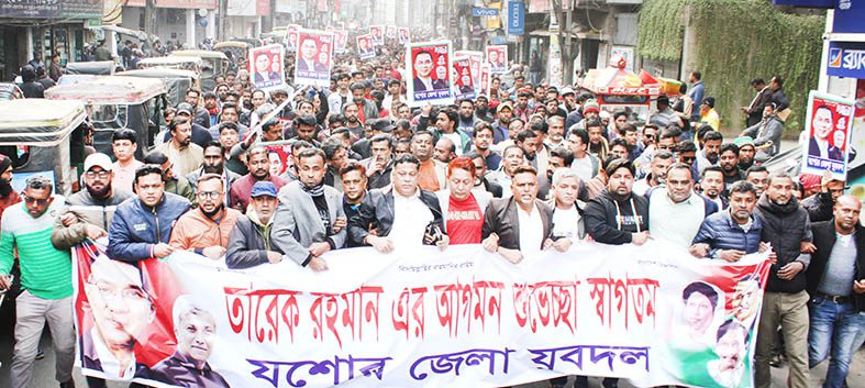 বিএনপির ভারপ্রাপ্ত চেয়ারম্যান তারেক রহমানের আগমনকে স্বাগত জানিয়ে যশোর জেলা যুবদল রোববার (২১ ডিসেম্বর) একটি উৎসবমুখর মিছিল করেছে। জেলা যুবদলের আহ্বায়ক এম তমাল আহমেদ ও সদস্য সচিব আনসারুল হক রানার নেতৃত্বে জেলা বিএনপি কার্যালয় থেকে মিছিলটি শুরু হয়ে এমকে রোড, চৌরাস্তা মোড়, আর এন রোড হয়ে মনিহারে গিয়ে শেষ হয়।