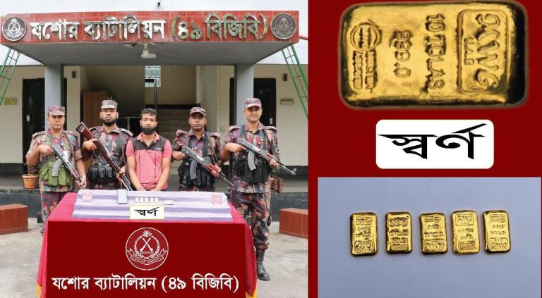 যশোরের খুলনা-যশোর মহাসড়কের মুড়লী বাস স্ট্যান্ড এলাকায় গোপন সংবাদের ভিত্তিতে অভিযান চালিয়ে ৫৮৫ গ্রাম ওজনের ৫টি স্বর্ণের বারসহ এক চোরাকারবারীকে আটক করেছে বর্ডার গার্ড বাংলাদেশ (বিজিবি)। বৃহস্পতিবার (২১ আগস্ট ২০২৫) সকাল ৯টা ৩০ মিনিটের দিকে যশোর ব্যাটালিয়নের (৪৯ বিজিবি) একটি চৌকস টহল দল এই অভিযান চালায়। বিজিবি সূত্রে জানা যায়, খুলনা-যশোর মহাসড়কের মুড়লী মোড়ে সন্দেহভাজন অবস্থায় এক ব্যক্তিকে চ্যালেঞ্জ করলে তার কোমরে বিশেষভাবে লুকানো অবস্থায় স্বর্ণের বারগুলো উদ্ধার করা হয়।