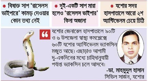 এদিকে সদ্য যোগদানকারী জেলা সিভিল সার্জন ডা. মাহমুদুল হাসান বলেন, অভয়নগর ও বাঘারপাড়া দুইটি উপজেলা ব্যতীত সকল উপজেলা স্বাস্থ্য কমপ্লেক্সে পর্যাপ্ত সাপে কাটা অ্যান্টিভেনম ভ্যাকসিন মজুত আছে। এ দুটি উপজেলাতে প্রয়োজনমতো অন্য উপজেলা ও যশোর জেনারেল হাসপাতাল থেকে সরবরাহ করা হবে। বর্তমানে যশোর জেনারেল হাসপাতালসহ উপজেলায় ১৫০টি অ্যান্টিভেনম ভ্যাকসিন মজুত আছে। এর মধ্যে যশোর জেনারেল হাসপাতালে ৯০টি ও ৬ উপজেলা স্বাস্থ্য কমপ্লেক্সে ৬০টি মজুত রয়েছে। এছাড়াও আগামী দু-একদিনের মধ্যে চাহিদানুযায়ী পর্যাপ্ত ভ্যাকসিন চলে আসবে। তিনি আরো বলেন, রাসেলস ভাইপার নিয়ে আতঙ্ক নয়, সচেতনতা বাড়াতে হবে। লম্বা ঘাস, ঝোপঝাড়, কৃষি এলাকায় হাঁটার সময় সতর্ক থাকতে হবে। গর্তে হাত-পা ঢুকানো যাবে না। কাজ করার সময় বুট এবং লম্বা প্যান্ট পরতে হবে, রাতে চলাচলের সময় টর্চ লাইট ব্যবহার করতে হবে, বাড়ির চারপাশ পরিস্কার ও আবর্জনামুক্ত রাখতে হবে। নারীদের ক্ষেত্রে বলেন, জ্বালানি লাকড়ি, খড় সরানোর সময় বিশেষ সাবধানতা অবলম্বন করতে হবে।